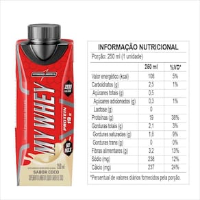 My whey é o proteico pronto para beber que possui uma fórmula premium, elaborada com proteínas de alta qualidade, e que não possui leite ou lactose em sua composição. My whey é um produto altamente proteico, com fontes de fibra, baixos teores de gordura e carboidratos, o que o torna ainda mais saudável e versátil para ser consumido á qualquer momento do dia. Com até 20 gramas de proteína e 8 gramas de aminoácidos essenciais por dose. Proteínas: my whey possui whey protein concentrado em sua composição proteica, que é uma proteína de alto valor nutricional. Aminoácidos essenciais: my whey possui 8g de aminoácidos essenciais. Esses aminoácidos não são produzidos pelo nosso organismo e por isso devem ser ingeridos pela dieta e/ou suplementação. Uma das principais funções dos aminoácidos é propiciar a construção muscular, por isso, para quem deseja o aumento de massa muscular é imprescindível o consumo em sua dieta.No milk: my whey não contém adição de leite em sua fórmula, e por isso é um produto seguro também para pessoas intolerantes à lactose. Além de ser o produto dessa categoria com a menor quantidade de carboidratos do mercado.Ingredientes:água, caseinato de cálcio, proteína de soro do leite concentrada, polidextrose, cacau, triglicerídeos de cadeia média, cloreto de sódio, reguladores de acidez fosfato dipotássico e fosfato dissódico, espessantes goma gelana e carragena e edulcorante sucralose.
