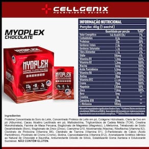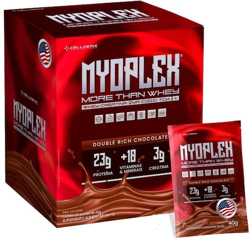 DESCRIÇÃOMyoplex é mais que um whey!Todos os benefícios disponíveis em um sachê prático, que é composto por CREATINA (3g), COENZINA Q10, Z.M.A e MACA PE, fácil de transportar, bastando você adicionar água para fazer um shake delicioso e nutritivo que irá promover e eliminar a vontade de ingerir calorias vazias.Além de entregar 18 vitaminas em sua composição, o Myoplex é o que você precisa ter mais energia, bom funcionamento da pele e cabelo.Myoplex é único. Myoplex é Cellgenix Nutritional Science.BENEFICIOS18 vitaminas e minerais;Auxilia no metabolismo;Entrega potência e boa recuperação;Nutrição proteica time release;Otimiza exercícios de alta intensidade;Diminui o tempo de recuperação entre as séries;Melhora a hidratação;SUGESTÃO DE USOConsumir 1 sachê (40g) diluído em 200ml de água gelada e/ou leite desnatado uma vez ao dia ou conforme a orientação de um médico ou nutricionista.Dica: para ainda mais cremosidade, adicione algumas pedras de gelo e bata no liquidificador.NÃO CONTÉM GLUTÉN.CONTÉM LACTOSE.Produto dispensado de registro RDC nº 27/2018.