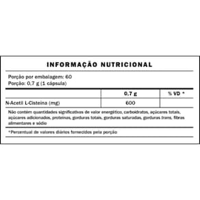 Suplemento alimentar em cápsulas com N-Acetil L-Cisteína, um derivado do aminoácido cisteína, amplamente utilizado na rotina de quem busca um cuidado nutricional complementar. Modo de Uso Consumir 1 cápsula ao dia. Ingredientes , amido de milho, estabilizante croscarmelose sódica, antiumectante dióxido de silício, lubrificante estearato de magnésio e cápsula vegetal derivada da celulose. NÃO CONTÉM GLUTEN. Não contém alergênicos USO ADULTO. NÃO EXCEDER A RECOMENDAÇÃO DIÁRIA DE CONSUMO INDICADA NA EMBALAGEM. Marca: Não Informado