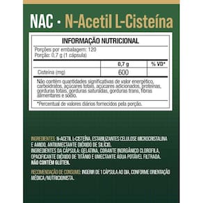 Vantagens: Fabricação com tecnologia avançada Livre de glúten Concentração elevada Potência superior no mercado 600mg de n-acetil l-cisteína pura Marca: Nutrione