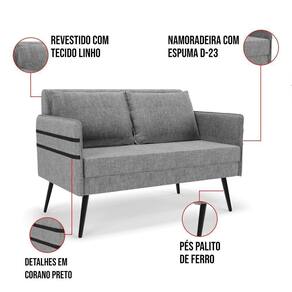 Que tal a Namoradeira Mari? Imagine-se utilizando esse produto e usufruindo de todos os benefícios que ela oferece. Usar essa Namoradeira é bem simples! Pode ser utilizada para evidenciar e enriquecer o seu ambiente, descansar depois de um dia longo de trabalho, ver aquela série favorita ou simplesmente ler seu livro predileto. Sua estrutura é confeccionada em madeira de eucalipto proveniente de reflorestamento, suportando em média até 120 Kg, possuí Pés Palito de Ferro, garantindo uma maior resistência e durabilidade ao produto, o estofamento do assento e encosto é composto de espuma D-23, revestido em tecido Linho no tom Grafite. Então, se a sua dificuldade é a otimização de espaço, esta namoradeira além de confortável e sofisticada, traz toda a funcionalidade que você precisa. Apenas algumas unidades estão disponíveis, separe o sua Namoradeira Mari antes que acabem! Dimensões da Namoradeira: Altura total: 82 cm Largura total: 110 cm Profundidade total: 74 cm Altura do encosto: 35 cm Largura do assento: 104 cm Profundidade do assento: 57 cm Altura do chão ao assento: 47 cm Espessura do assento: 22 cm Altura do chão ao braço: 46 cm Altura interna do braço: 19 cm Tamanho dos pés: 25 cm Espessura do braço: 4 cm Peso: 20 kg Dimensões da Almofada: Altura total: 34 cm Largura total: 51 cm Profundidade total: 20 cm Peso: 0,3 kg Especificações do Produto Estrutura: Madeira Eucalipto Espuma: D-23 Tecido: Linho Tipo de pés: Pés Palito de Ferro Peso suportado: Até 120 Kg Garantia: 90 dias contra defeito de fabricação Montagem: O produto vai montado, apenas rosquear os pés Instruções de limpeza: Utilizar um pano limpo e levemente úmido Você irá receber: 01 Volume com 01 Namoradeira Observações Relevantes - Todos os produtos vão embalados com total segurança; - As cores dos produtos podem sofrer alterações dependendo do seu monitor; - Para futuras compras, não garantimos a mesma tonalidade de cor, pois existe variação a cada lote do fabricante do tecido; - As imagens são meramente ilustrativas, não acompanham objetos de decoração e eletros; - Confira as dimensões do produto no momento da compra e certifique-se de que passará normalmente por escadas, elevadores, portas e corredores; - Importante: Por se tratar de estofado as medidas podem ter uma pequena variação em até 3 cm; - Não nos responsabilizamos no ato da entrega por montagens, desmontagens, instalações de produtos; - Não nos responsabilizamos no ato da entrega por subir escadas, elevadores, nem utilização de guinchos ou equipamentos similares para acesso a pisos superiores em apartamentos; - A entrega do produto é realizada em todo território nacional, até onde as rodovias alcançam, entregas fluviais ou aéreas devem ser cotadas a parte; - Observando as orientações acima, evita-se futuros desagrados ou imprevistos com a entrega do produto. Havendo despesas adicionais, serão de responsabilidade do cliente;