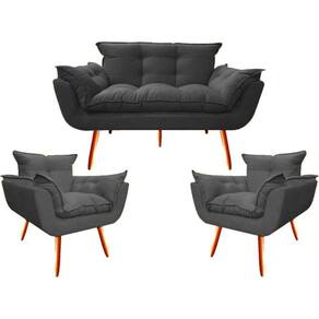 Namoradeira + 2 Poltronas Opalla Decorativa Reforçada Recepção Sala De Estar Suede - Cinza