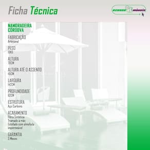Namoradeira área Externa Aço Carbono Fibra Sintética Córdova Preto/verde Procurando sofisticacao ao seu ambiente? A Namoradeira Cordova e ideal para trazer conforto e sofisticacao ao seu ambiente. Fabricada com estrutura em aco carbono e acabamento em fibra sintetica, oferece alta resistencia as ocasioes, garantindo durabilidade e beleza por mais tempo. Seu assento e encosto sao estofado com tecido impermeavel proporciona maior conforto e praticidade, ideal para momentos de lazer e descontracao. Produzida de forma artesanal, a namoradeira Cordova combina elegancia e exclusividade no design. E uma excelente opcao para areas gourmet, espacos internos, churrasqueira, recepcao, ediculas e outros ambientes que pedem charme e aconchego.