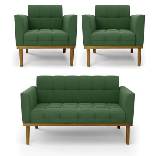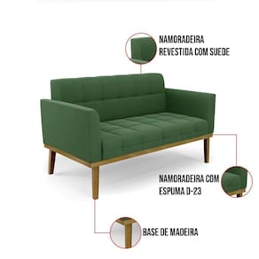 Você gosta de colecionar vários momentos memoráveis com sua família e amigos? Que tal recebê-los, com móveis de altíssima qualidade que só a D'Rossi tem? O Sofá Namoradeira com Poltrona Elisa é adequado para você! Seu design retrô é a grande tendência do momento. Pode ser utilizado em diversos espaços da casa, em salas, hall de entrada, quartos, cozinhas, varanda, sacada, escritório, dentre outros. Contém as seguintes características: A estrutura é feita de madeira de Eucalipto 100% de reflorestamento, e a Base de Madeira Fixa Castanho, além de ser resistente e durável, suporta em média até 120 kg. Assento, encosto e braços, contém enchimento de espuma D-23 e é estofada em tecido Suede, no tom Verde, que oferece muito conforto e resistência ao sentar, com aquela sensação de maciez e aconchego. Possui também, detalhes de costura no encosto e assento, resultando em um acabamento impecável, conferindo muito mais valor e elegância ao seu espaço. Para complementar a decoração com esse lindo kit Sofá Namoradeira com 02 Poltronas Elisa, a dica é utilizar mantas, almofadas ou vasinho de flor. E pronto, seu cantinho estará perfeito para descansar e relaxar! Aqui, você encontra várias opções, para que seus amigos e familiares se sintam acolhidos. Garanta já seu kit Sofá Namoradeira com 02 Poltronas Elisa.