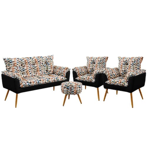 Características do Produto: Madeira de eucalipto proveniente de reflorestamento Fixação com grampos galvanizados Espuma Poliuretano D20 Produto costurado Produto almofadado Tamanho: Único Possui pés: Sim Tipo de pés: Pés palitos Possui 15 pés palitos de 25 cm Namoradeira suporta até 200 kg Poltronas suportam até 90 kg Puff suporta até 90 kg Embalagem: plástico bolha, papelão ondulado, malha, plástico Garantia de 3 meses contra defeitos de fábrica.