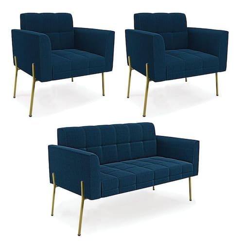 O Sofá Namoradeira e 2 Poltronas Elisa é uma mobília que combina elegância, conforto e durabilidade. Ele tem um design retrô e sofisticado, com Pés Laterais de Ferro Dourado e revestimento em tecido Bouclê Azul, que harmonizam com qualquer ambiente. Ele é ideal para sala de estar, recepções, escritórios, cozinhas ou qualquer outro espaço que você queira decorar com estilo e bom gosto. Ele tem uma estrutura em madeira de reflorestamento eucalipto, que garante a resistência e a sustentabilidade do produto. Ele suporta até 180 kg de peso, podendo ser utilizada por pessoas de diferentes biotipos. Ele tem um acabamento reforçado e espuma de qualidade D23, que oferece maciez e aconchego. Ele contém detalhes de costura no encosto e assento, resultando em um acabamento impecável, conferindo muito mais valor e elegância ao produto. O Sofá Namoradeira e 2 Poltronas Elisa é um móvel de alta qualidade, beleza e funcionalidade. Ele é fácil de transportar, pois tem um peso leve e um tamanho compacto. O Sofá Namoradeira e 2 Poltronas Elisa é um produto que vai fazer a diferença na sua decoração e no seu bem-estar. Ele vai trazer charme, conforto e durabilidade para o seu ambiente. Aproveite essa oferta e leve para casa um Sofá Namoradeira e 2 Poltronas de qualidade por um preço incrível. Essa é a sua chance de ter um Sofá Namoradeira e 2 Poltronas maravilhoso por um preço imperdível. Corra e garanta o seu antes que acabe o estoque!