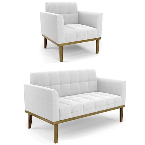 O Sofá Namoradeira e a Poltrona Para Sala são revestidos em Bouclé, que é confortável, suave ao toque, e valoriza o design das peças. Eles têm braços e encosto em espuma D-18 e assento em espuma D-26, que oferecem firmeza e aconchego para você relaxar. A base em madeira de eucalipto castanho é um detalhe charmoso, que dá um toque rústico e sofisticado ao conjunto. O kit tem uma estrutura resistente e suporta até 120 kg cada peça. A montagem é simples, pois as peças já vêm prontas, bastando fixar a base com os parafusos que acompanham o produto. A limpeza é prática, pois basta usar um pano limpo e levemente úmido, sem produtos abrasivos, para manter o seu kit sempre em bom estado. Hora de transformar seu ambiente com a Namoradeira 2 Lugares e a Poltrona para Sala deixando ainda mais confortável e estiloso.