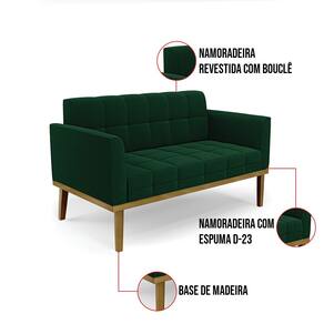 O Sofá Namoradeira e Poltrona Elisa é uma mobília que combina elegância, conforto e durabilidade. Ele tem um design retrô e sofisticado, com Base de Madeira Fixa Castanho e revestimento em tecido Bouclê Verde, que harmonizam com qualquer ambiente. Ele é ideal para sala de estar, recepções, escritórios, cozinhas ou qualquer outro espaço que você queira decorar com estilo e bom gosto. Ele tem uma estrutura em madeira de reflorestamento eucalipto, que garante a resistência e a sustentabilidade do produto. Ele suporta até 180 kg de peso, podendo ser utilizada por pessoas de diferentes biotipos. Ele tem um acabamento reforçado e espuma de qualidade D23, que oferece maciez e aconchego. Ele contém detalhes de costura no encosto e assento, resultando em um acabamento impecável, conferindo muito mais valor e elegância ao produto. O Sofá Namoradeira e Poltrona Elisa é um móvel de alta qualidade, beleza e funcionalidade. Ele é fácil de transportar, pois tem um peso leve e um tamanho compacto. O Sofá Namoradeira e Poltrona Elisa é um produto que vai fazer a diferença na sua decoração e no seu bem-estar. Ele vai trazer charme, conforto e durabilidade para o seu ambiente. Aproveite essa oferta e leve para casa um Sofá Namoradeira e Poltrona de qualidade por um preço incrível. Essa é a sua chance de ter um Sofá Namoradeira e Poltrona maravilhoso por um preço imperdível. Corra e garanta o seu antes que acabe o estoque!