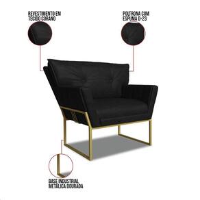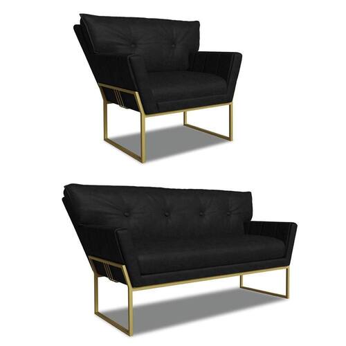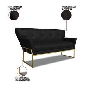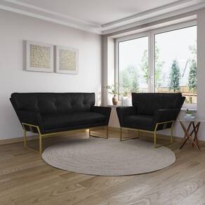 O Sofá Namoradeira e Poltrona Anitta é uma peça que combina beleza, conforto e funcionalidade. Ele tem um design contemporâneo, sofisticado e um revestimento em tecido Sintético PU Preto que harmonizam com qualquer ambiente. Possui uma base industrial dourada com um belo detalhe trabalhado no metal, que além de adicionar um toque de charme à peça, oferece um suporte sólido e , garantindo conforto superior ao sentar. Ideal para sala de estar, recepções, escritórios ou qualquer outro espaço que você queira decorar com estilo e bom gosto. Produzido cuidadosamente em madeira de reflorestamento eucalipto, que garante a resistência e a sustentabilidade do produto. Ele suporta até 180 kg de peso, podendo ser utilizado por pessoas de diferentes biotipos. Ele tem um acabamento reforçado e espuma de qualidade D23, que oferece maciez e aconchego. A almofada fixa do encosto é revestida com fibra siliconada e conta com um detalhe elegante em botonê, que não só valoriza o design, mas também proporciona uma sensação de conforto inigualável. O encosto levemente triangular de ambos adiciona uma estética exclusiva, enquanto os braços, com delicados frisos na costura enriquecem ainda mais o produto. O Sofá Namoradeira e Poltrona Anitta é um kit de alta qualidade, sutileza e versatilidade. Ele é fácil de transportar, pois tem um peso leve e um tamanho compacto. O Sofá Namoradeira e Poltrona Anitta é um produto que vai fazer a diferença na sua decoração e no seu bem-estar. Ele vai trazer personalidade e inovação para o seu ambiente. Aproveite essa e leve para casa um sofá namoradeira e poltrona de qualidade por um preço incrível. Essa é a sua chance de ter um conjunto atraente na sua decoração por um preço imperdível. Corra e garanta o seu antes que acabe o estoque!