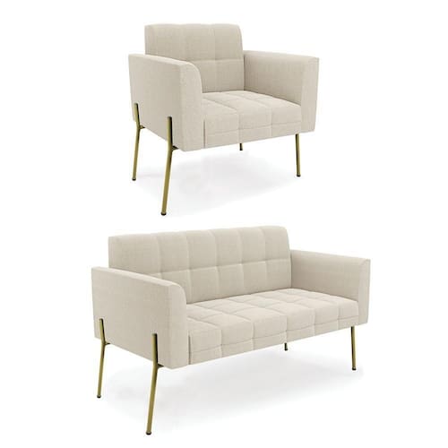 O Sofá Namoradeira e Poltrona Elisa é uma mobília que combina elegância, conforto e durabilidade. Ele tem um design retrô e sofisticado, com Pés Laterais de Ferro Dourado e revestimento em tecido Bouclê Bege, que harmonizam com qualquer ambiente. Ele é ideal para sala de estar, recepções, escritórios, cozinhas ou qualquer outro espaço que você queira decorar com estilo e bom gosto. Ele tem uma estrutura em madeira de reflorestamento eucalipto, que garante a resistência e a sustentabilidade do produto. Ele suporta até 180 kg de peso, podendo ser utilizada por pessoas de diferentes biotipos. Ele tem um acabamento reforçado e espuma de qualidade D23, que oferece maciez e aconchego. Ele contém detalhes de costura no encosto e assento, resultando em um acabamento impecável, conferindo muito mais valor e elegância ao produto. O Sofá Namoradeira e Poltrona Elisa é um móvel de alta qualidade, beleza e funcionalidade. Ele é fácil de transportar, pois tem um peso leve e um tamanho compacto. O Sofá Namoradeira e Poltrona Elisa é um produto que vai fazer a diferença na sua decoração e no seu bem-estar. Ele vai trazer charme, conforto e durabilidade para o seu ambiente. Aproveite essa oferta e leve para casa um Sofá Namoradeira e Poltrona de qualidade por um preço incrível. Essa é a sua chance de ter um Sofá Namoradeira e Poltrona maravilhoso por um preço imperdível. Corra e garanta o seu antes que acabe o estoque!