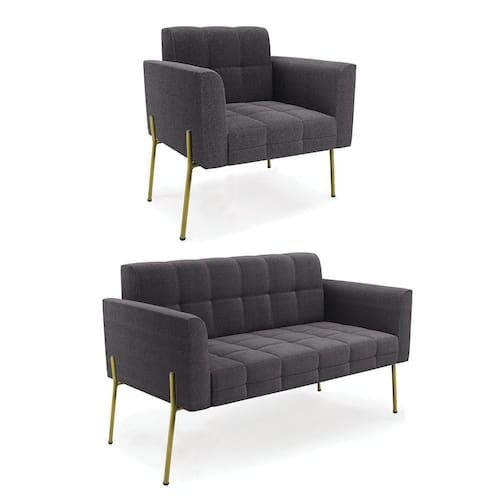 O Sofá Namoradeira e Poltrona Elisa é uma mobília que combina elegância, conforto e durabilidade. Ele tem um design retrô e sofisticado, com Pés Laterais de Ferro Dourado e revestimento em tecido Bouclê Grafite, que harmonizam com qualquer ambiente. Ele é ideal para sala de estar, recepções, escritórios, cozinhas ou qualquer outro espaço que você queira decorar com estilo e bom gosto. Ele tem uma estrutura em madeira de reflorestamento eucalipto, que garante a resistência e a sustentabilidade do produto. Ele suporta até 180 kg de peso, podendo ser utilizada por pessoas de diferentes biotipos. Ele tem um acabamento reforçado e espuma de qualidade D23, que oferece maciez e aconchego. Ele contém detalhes de costura no encosto e assento, resultando em um acabamento impecável, conferindo muito mais valor e elegância ao produto. O Sofá Namoradeira e Poltrona Elisa é um móvel de alta qualidade, beleza e funcionalidade. Ele é fácil de transportar, pois tem um peso leve e um tamanho compacto. O Sofá Namoradeira e Poltrona Elisa é um produto que vai fazer a diferença na sua decoração e no seu bem-estar. Ele vai trazer charme, conforto e durabilidade para o seu ambiente. Aproveite essa oferta e leve para casa um Sofá Namoradeira e Poltrona de qualidade por um preço incrível. Essa é a sua chance de ter um Sofá Namoradeira e Poltrona maravilhoso por um preço imperdível. Corra e garanta o seu antes que acabe o estoque!
