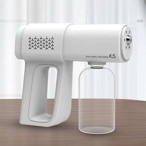 Pistola nano spray Modelo: k5 Tamanho: 223 x 192 x 65 mm Tensão de trabalho: 3.7 vdc Potencia: 15w Garrafa: 380 ml Alcance do spray: 1 a 1,5 metro Bateria: 2000 mah recarregável Tensão da carga: 5vdc / 1a