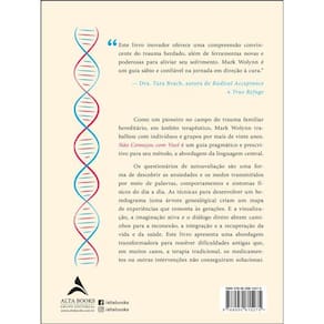 “Este livro inovador oferece uma compreensão convincente do trauma herdado, além de ferramentas novas e poderosas para aliviar seu sofrimento. Mark Wolynn é um guia sábio e confiável na jornada em direção à cura.” — Dra. Tara Brach, autora de Radical Acceptance e True Refuge Como um pioneiro no campo do trauma familiar hereditário, em âmbito terapêutico, Mark Wolynn trabalhou com indivíduos e grupos por mais de vinte anos. Não Começou com Você é um guia pragmático e prescritivo para seu método, a abordagem da linguagem central. Os questionários de autoavaliação são uma forma de descobrir as ansiedades e os medos transmitidos por meio de palavras, comportamentos e sintomas físicos do dia a dia. As técnicas para desenvolver um heredograma (uma árvore genealógica) criam um mapa de experiências que remonta às gerações. E a visualização, a imaginação ativa e o diálogo direto abrem caminhos para a reconexão, a integração e a recuperação da vida e da saúde. Este livro apresenta uma abordagem transformadora para resolver dificuldades antigas que, em muitos casos, a terapia tradicional, os medicamentos ou outras intervenções não conseguiram solucionar.