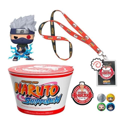 Uma figura Funko Pop Kakashi Hatake 822 Exclusivo; Um cordão e decalque Teuchi; 4 Pins Naruto, Sasuke, Sakura e Símbolo da Aldeia da Folha ; Um Sticker.