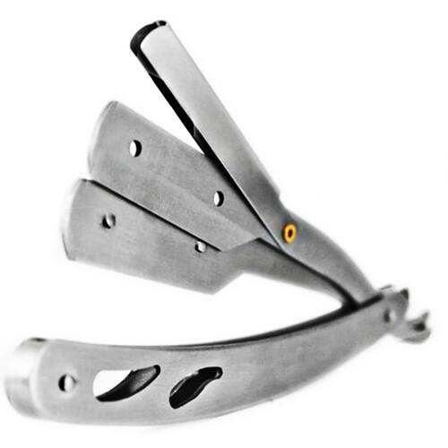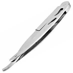 - Próprio para o uso de lâminas descartáveis - Possui apoio para dedo - Formato anatômico - Hastes em aço inox - Cabo em inox - Modelo Homem Bruto - Linha GOLD
