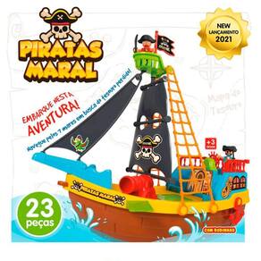 O conjunto de brinquedo acompanha 23 acessórios para montar o navio e sair navegando pelos 7 mares