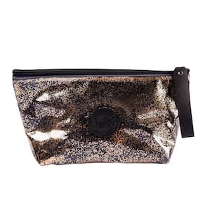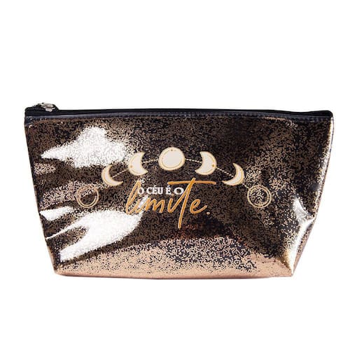 necessaire com um bolso com fechamento em zíper, possui alça para carregar por aí Revestida em PVC com glitter dourado.