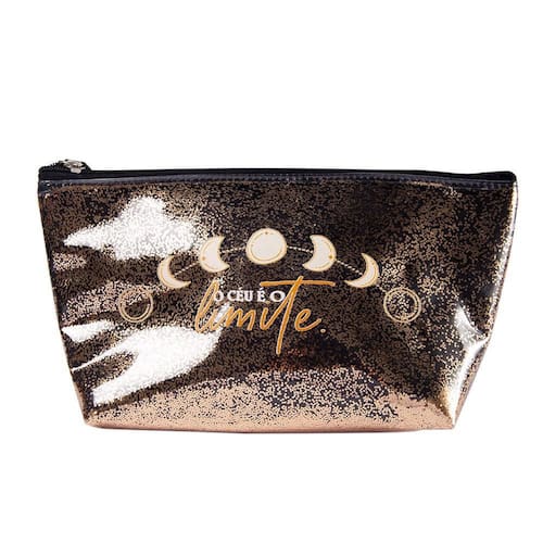 necessaire com um bolso com fechamento em zíper, possui alça para carregar por aí Revestida em PVC com glitter dourado. material: Revestimento: 85% Poliéster e 15% PVC. Enchimento: 100% Fibra Siliconada. Cuidados: Limpar com pano levemente úmido. Não utilizar alvejantes à base de cloro. Não passar o ferro. Medidas aproximadas do produto - Comprimento: 27 cm - Altura: 7 cm - Largura: 7 cm - Peso: 99 g Ficha técnica - Cor: Dourado Marca: Não Informado