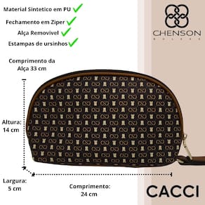 Produzida em material sintético de alta qualidade, ela oferece excelente resistência e durabilidade. O fechamento em ecler garante segurança aos pertences, enquanto o acabamento cuidadoso reflete o padrão de qualidade que a marca Chenson representa. É uma peça que alia beleza e funcionalidade, perfeita para guardar maquiagens, acessórios ou pequenos objetos pessoais.