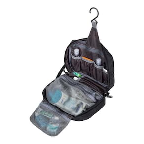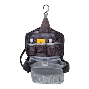Nécessaire com grande espaço interno desenvolvida para viagens ou uso diário. Possui gancho para pendurar, diferentes compartimentos e bolsos que ajudam na organização dos itens de higiene pessoal e estética. Inclui espelho removível e dois frascos para shampoo e condicionador.