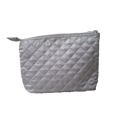 Necessaire matelasse prata tamanho médio com fechamento em zíper. Prático e versátil, ele organiza e armazena seus produtos de beleza, ideal para o dia a dia.