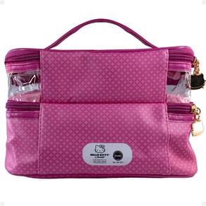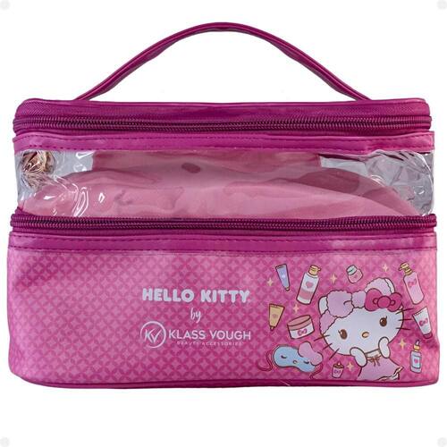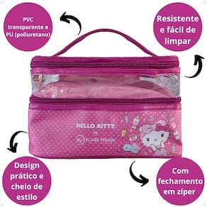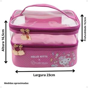 A Necessaire Rosa Hello Kitty by Klass Vough oferece uma maneira encantadora de organizar seus itens de beleza. Ela possui dois compartimentos distintos: um transparente, com 7cm de altura, que facilita a visualização dos itens, e outro estampado com figuras da Hello Kitty, com 9,5cm de altura, para guardar seus acessórios de forma segura e estilosa. Com um design prático e cheio de estilo, esta necessaire é perfeita para manter tudo em ordem com um toque de fofura. A estampa da Hello Kitty adiciona um toque de charme e diversão à sua necessaire, tornando-a não apenas funcional, mas também uma peça de destaque em seu conjunto de acessórios. Feita de PVC transparente e PU (poliuretano) durável, esta necessaire é resistente e fácil de limpar, garantindo que seus produtos de beleza permaneçam protegidos e organizados por muito tempo.