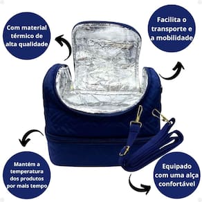 A Necessaire Térmica Rubys com Alça na elegante cor azul marinho é a escolha perfeita para quem valoriza praticidade e estilo. Ideal para manter seus itens essenciais organizados e protegidos, esta necessaire é perfeita para viagens, trabalho ou uso diário. Confeccionada com material térmico de alta qualidade, a necessaire mantém a temperatura dos seus produtos por mais tempo, garantindo que itens como cosméticos e medicamentos estejam sempre na temperatura ideal. Equipado com uma alça confortável, facilita o transporte e a mobilidade, permitindo que você leve sua necessaire com facilidade aonde for.