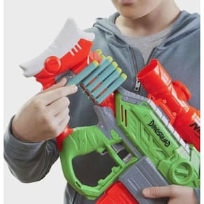 A aventura ganha novas emoções com estes lançadores do time de elite DinoSquad Os mais poderosos dinossauros inspiram o design destes lançadores, trazendo grande ação à aventura Entrar na aventura com o poder de um tiranossauro com o lançador Nerf DinoSquad Rex-Rampage Possui um design impressionante de dinossauro Tyrannosaurus Rex. Basta ligar o motor e pressionar a alavanca de disparo para lançar dardos rapidamente. Ele vem com um clip de 10 dardos para lançar 10 dardos seguidos antes de recarregar novamente. Possui porta-dardos para 10 dardos no apoio, facilitando o momento da recarga. O lançador inclui uma mira acoplada para alinhar o alvo. Ele vem com 20 dardos oficiais de espuma Nerf Elite que são testados e aprovados para desempenho e qualidade. Óculos recomendados não incluídos .