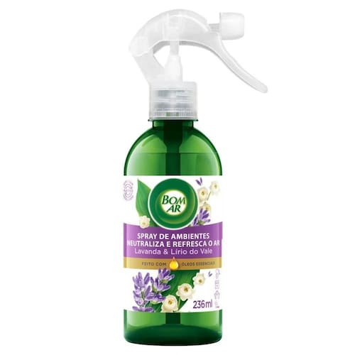 Neutralizador de odores spray lavanda & lírio do vale bom ar frasco 236ml Novo spray de ambientes bom ar. Nada além do que você precisa para neutralizar os maus odores e refrescar sua casa feito com poderosas moléculas capazes de neutralizar maus odores e perfumar o ambiente. Fragrância com óleos essenciais naturais. Neutraliza maus odores de banheiro, cozinha, animais domésticos, e frituras.