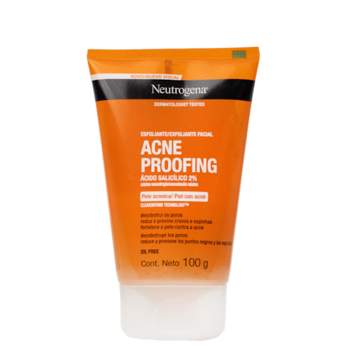 Esfoliante facial para peles com acne. Neutrogena Acne Proofing Esfoliante ajuda no tratamento contra a acne enquanto desobstrui os poros, reduz cravos e espinhas.