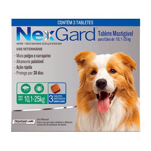 Nexgard - Bula (10,1 a 25 kg 3 Tabletes Mastigáveis) NexGard (afoxolaner) está disponível em quatro apresentações de antiparasitários na forma de tabletes mastigáveis macios com sabor de carne bovina