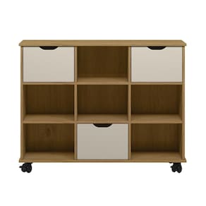 Nicho Organizador 1478 com 3 Gavetas - Qmovi O Nicho Organizador foi pensado para facilitar o processo de organização. É um produto muito prático que pode ser utilizado em diversos ambientes como quarto infantil, sala de estar e escritório. Ele possui 9 compartimentos internos que contribuem para organização do local e rodízios que facilitam a locomoção. Acompanha Kit com 3 Gavetas, um módulo opcional que foi feito para incrementar o Nicho Organizador, melhorando sua divisão interna e dando mais beleza e praticidade ao seu ambiente. As gavetas contam com fitas de feltro na parte inferior para não danificar o móvel.