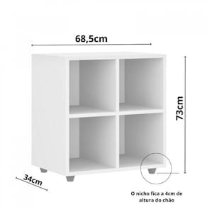 O nicho possui 4 compartimentos, para acomodar livros, brinquedos e uma diversidade de objetos da criança. Otimiza espaço e mantém os ambientes organizados. Acompanha o kit de segurança com sistema antitombamento, proporcionando maior segurança e evitando acidentes. Obs: imagens meramente ilustrativas, decoração não acompanha o móvel. Parafusos ficam a mostra, por segurança não foram utilizados tapa-furos. Não realizamos a montagem. Ambiente Principal: Quarto Infantil Complexidade da Montagem: Baixa: pode ser montado por uma pessoa sozinha Cor: Branco Cor do Produto: Branco Escala de Brilho: Fosco Itens Inclusos: 1 Nicho, kit ferragens e manual de montagem Manual de Montagem e Instalação: https://cdn2.madeiramadeira.com.br/atributo/movelbras/858185-p22-nicho-4-lugares-manual.pdf Material da Prateleira: MDP Material do Fundo: MDP Material Principal: MDP Necessita Montagem: Sim Origem do Produto: Nacional Peso: 8,2 kg Peso Máximo por Prateleira: 6 kg Possui Espelho: Não Possui Possui Fundo: Sim Possui Portas: Não Possui Prateleiras: 04 Possui Toalheiro: Não Recomendações de Uso, Manutenção e Limpeza: Pano umedecido com álcool 70%. Sistema de Montagem: Cavilha, parafusos, cantoneiras, sistema anti-tombamento Suporta Até (kg): 24 kg Tipo de Nicho: Prateleira