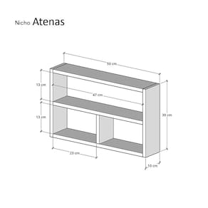 Com medidas de 30cm de altura x 50cm de largura x 10cm de profundidade, o nicho Atenas é compacto e versátil, se encaixando perfeitamente em diferentes espaços.