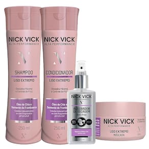 O Kit Shampoo Condicionador Máscara e Fluido Acelerador Liso Extremo Nick Vick foi desenvolvido para atender o desejo de um efeito liso por mais tempo com a hidratação dos fios e selagem das cutículas.