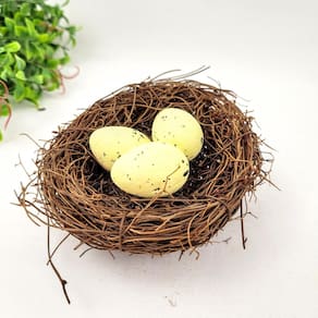 Estilo Natural: O ninho é confeccionado em cipó, transmitindo uma aparência rústica e autêntica. Adornos Delicados: Contém três ovos de isopor medindo 3,5x2,5 cm, que se encaixam perfeitamente no ninho. Dimensões Ideais: Com uma altura de 5 cm e diâmetro de 12 cm, é leve com apenas 25g, fácil de manusear.