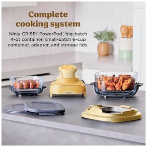 Sistema All-in-One Ninja Crispi PowerPod, contêineres de vidro CleanCrisp, 6 copos, adaptador de contêiner, 2 tampas de armazenamento, 2 placas crocantes. Funcionalidade 4 em 1: Max Crisp, Assar, Air Fry e Recrisp. Proteção térmica fixa. Tampas com trava. Fácil de armazenar.Porta-fio