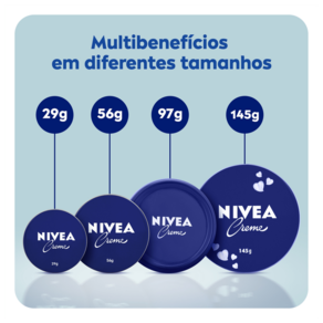 O Hidratante NIVEA Creme Lata é multibenefícios e considerado um clássico do skincare, com mais de 100 anos de história. Pode ser utilizado em qualquer parte do corpo, principalmente as áreas mais ressecadas como: pés, joelhos e cotovelos. Seu uso ajuda a proteger do frio, hidratar no pós-barba e ainda acompanhar uma massagem em um momento de relaxamento.