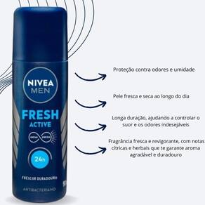 Nivea Desodorante Spray For Men Fresh Active 90ml Controlado NãO Laboratorio NIVEA Specialfromdate 2025-02-15 00:00:00 Taxclassid NENHUM Rmpagsegurolastupdate 0 Nivea Desodorante Spray For Men Fresh Active 90mlbr / O desodorante da Nivea For Men Fresh Active foi projetado especialmente para homens que buscam proteção e frescor duradouros. Sua fórmula conta com agentes que garantem qa proteção contra odores e umidade, mantendo sua pele seca e fresca ao longo do dia. Contando também com uma fragrância revigorante que combina notas cítricas e herbais, que te proporcionam aroma agradável, duradouro e fresco. De longa duração, ajuda a controlar os odores indesejáveis que acompanham o suor. Seus ativos auxiliam no cuidado da pele na região das axilas, evitando irritações e desconfortos. Produto prático e fácil para ser no seu dia-a-dia, que te presenteia com proteção duradoura e fácil aplicação. br / Advertências:br / - Em caso de contato acidental com os olhos, lave-os com água corrente em abundância - Não utilizar próximo aos olhos ou em áreas sensíveis Marca: Não Informado