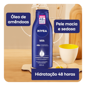 A Loção Hidratante NIVEA Milk usa ingredientes cuidadosamente selecionados para equilibrar a pele de maneira prolongada e sem irritar as dermes sensibilizadas pelo ressecamento. Sua fórmula conta com 2 vezes mais Óleo de Amêndoas. Ainda possui uma fórmula cremosa e de rápida absorção que evita a perda de umidade.