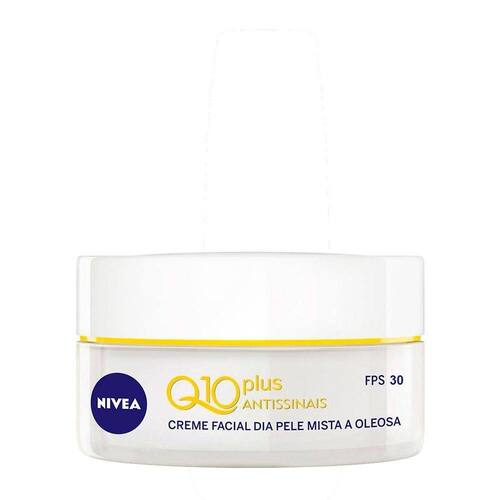 Q10 Plus Antissinais Creme Facial Dia FPS 15 Pele Normal a Mista reduz profundamente as rugas e previne o aparecimento de novos sinais de envelhecimento da pele. Protege contra a formação de sinais causados pelo sol, com proteção FPS 15. A coenzima Q10 e a Creatina são ativos poderosos encontrados naturalmente na pele. Com a idade, seus níveis diminuem, deixando a pele com menos energia para renovar-se. Com o passar do tempo a pele fica mais propensa a rugas e sinais de idade. NIVEA Q10 plus Antissinais combina a exclusiva Tecnologia MaxCreatina Ativa e Q10, em uma poderosa fórmula que repõe e aumenta os níveis desses ativos nas camadas mais profundas da pele, estimulando a produção de energia e atuando efetivamente contra os sinais da idade.