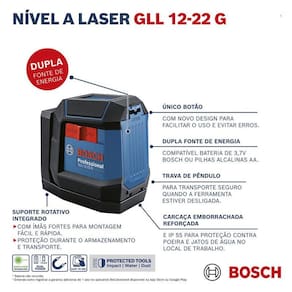 Nível a laser 2 linhas verdes gll12-22g bosch + bolsa bosch Nível a laser gll 12-22g com 2 linhas verdes horizontal e vertical + bolsa exclusiva bosch O gll 12-22g é o nivel a laser robusto para alinhamento rápido e preciso. Essa ferramenta compacta foi fabricada para suportar condições adversas. Possui carcaça reforçada com borracha e proteção ip55 contra poeira e respingos de água. Um suporte rotativo integrado com ímãs fortes garante Uma fixação estável e também protege o vidro do laser durante o armazenamento ou transporte. Com a operação simples do de ligar/desligar, o laser permite um raio de ação de até 12 metros e um alcance de autonivelamento de +/- 3,5. Esse nivel a laser tem uma tecnologia dual power source fonte de alimentação dupla e funciona com 2 pilhas alcalinas aa ou Com o acumulador de lítio ba 3.7v 1.0ah a professional, adquirido separadamente no catálogo da bosch. Isso significa nivelamento ininterrupto e maior sustentabilidade. Esse prático nivel a laser facilita o nivelamento preciso. É ideal para aplicações gerais de nivelamento. Características e diferenciais do gll 12-22g: Carcaça reforçada com borracha e proteção ip55 contra poeira e respingos de água para suportar condições adversas; Suporte rotativo integrado para montagem rápida e estável e para proteção durante o armazenamento e o transporte; Flexibilidade graças à tecnologia dual power source: 2 pilhas alcalinas aa ou ba 3.7v 1.0ah a professional disponível separadamente. Dados técnicos: Proteção contra pó e projeções de água: ip 55; Raio de ação: até 12 m; Precisão: 0,6 mm/m Mais divergência dependente do uso ; Projeção: 2 linhas; Raio de ação, valor: 12 m; Díodo laser: 500 - 540 nm, 5 mw; Temperatura de serviço: -10 - 40 c; Temperatura de armazenamento: -20 - 70 c; Classe de laser: 2; Gama de autonivelamento: 3.5; Tempo de nivelamento: 6 s; Alimentação elétrica: 2 x 1,5 v lr6 aa , bateria de lítio de 3,7 v 1.000 mah ; Tempo de autonomia máx. : 8 h; Rosca do tripé: 1/4; Peso aprox.: 0,35 kg; Cor da linha laser: verde. Obs: o gll 12-22g funciona com pilhas e bateria: as pilhas acompanham o produto, Mas a bateria é adquirida separadamente, caso o usuário prefira trabalhar com as duas opções. Itens que acompanham o produto: -suporte com imã acoplado no nível; -manual de usuário; -02 pilhas; -bolsa de transporte; -bolsa exclusiva bosch para transporte de ferramentas. Marca: Não Informado