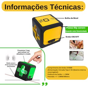 O Mini Nível Laser, é uma ferramenta super útil e prática para diferentes ambientes. Instalação de prateleiras, lâmpadas e luminárias no teto, espelhos, quadros, montagem de móveis. Feixes na cor verde com alcance de até 20M. Possui sensor de autonivelamento, com bip sonoro de alerta quando o aparelho se encontra desnivelado para medição. Bateria recarregável via USB e duradoura de até 6 horas, variando do seu uso. Seus feixes alcançam do chão ao teto parede na horizontal ao mesmo tempo quando bem posicionado, dentro do raio de 20M. O nível possui rosca de encaixe para tripés 1/4.