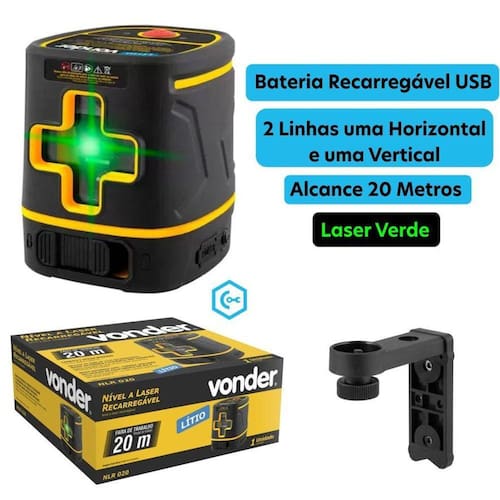 Nível a Laser Vonder 2 Linhas Verdes 20 Metros Bateria Lítio Recarregável USB NLR020