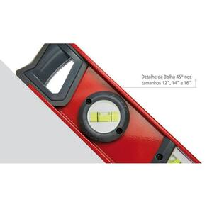Nível feito de alumínio com perfil retangular e extremidades emborrachadas e reforçada com plástico ABS para amortecer pequenos impactos.