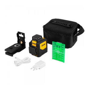 • 1 Nível a laser • 1 Bateria de íons de lítio • 1 Bolsa para armazenamento • 1 Fonte de carregamento • 1 Cabo para carregamento • 1 Suporte • 1 Placa alvo