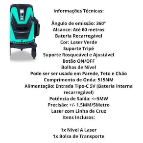 Vantagens: -nível laser com laser verde, que é 4x mais visível que o vermelho. -possui função de auto nivelamento nível, prumo e esquadro . -possui bateria recarregável. -informa o ponto de prumada. -informa quando o laser está desnivelado, piscando o laser. -pode ser utilizado com o pêndulo travado e pêndulo solto. -acompanha maleta rígida para guardar o equipamento e não pegar poeira.
