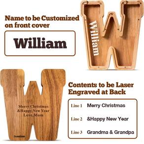 Tem dificuldade em comprar um presente para seus filhos ou netos? Aí vem! Nosso cofrinho grande e extra grande em forma de carta, feito de madeira 100% orgânica. É um presente perfeito para bebê/criança/ou qualquer pessoa com seus nomes em inglês! O vidro acrílico na parte superior permite ver através da caixa de moedas e avaliar o progresso da economia de dinheiro. Há um slot para moedas na parte superior, onde as moedas devem ser jogadas. E o slot é amplo o suficiente para qualquer moeda, moedas e notas. Você também pode ter seu nome completo gravado a laser no acrílico, o que o tornará único para você ou para a pessoa que você ama. Como sacar o dinheiro? Você pode abrir a caixa de dinheiro desparafusando vários pequenos parafusos e remover o vidro acrílico. - 🍭 Design recortado, muito maior. O último design do modelo PIGGY BANK, edição 2.0, baseado no anterior, o que faz com que pareça mais com letras. Formas de letras muito mais fofas com designs ampliados, uma capacidade maior, mais espessa, bonita, de alto volume e mais lisa do que outras no mercado! - 🍭 Brinquedos educativos, presente perfeito: este cofrinho de madeira será um presente perfeito. O design inicial personalizado das letras e o nome personalizado gravado a laser gravado a laser na capa de acrílico podem observar quanto dinheiro eles economizaram para promover uma sensação de economia desde tenra idade. Além disso, eles sentirão como foram tratados, o que ajudará a tornar o relacionamento mais próximo. - 🍭 MATERIAL E DESIGN ATUALIZADOS: A edição 2.0 de atualização aprimorou o processo de produção e o artesanato, as camas e nosso cofrinho de madeira. Madeira de nogueira de alta qualidade tornam nosso banco de troca de moedas natural, seguro e inquebrável. Além disso, eles podem funcionar como decoração de ornamento de madeira. - 🍭 SEGURO E PRÁTICO: O A-Z LETTER BANK é feito de 100% madeira, natural e durável. O serviço de nomes personalizado o tornou único como presente quando o bebê nasce e feriados como aniversário, volta às aulas, Ação de Graças, Natal e Ano Novo. Ótimo presente de boas-vindas para adultos como enfeite decorativo. Embalado com LOVE HOME SWEET HOME. - 🍭 SERVIÇO DE NOMES GRAVADOS A LASER: Agora temos suporte para gravação a laser de nomes e gravaremos o texto que você precisa no acrílico do seu cofrinho de cartas. Qualquer problema, gratuitamente, responderemos em 48 horas.
