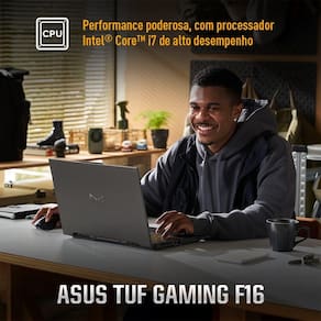 O poderoso notebook gamer ASUS TUF Gaming F16 une performance de alto nível com design robusto e estiloso. Feito para gamers exigentes e profissionais que buscam tecnologia de ponta, este computador transforma a experiência de jogo e trabalho, com processador Intel Core i7 13620H de alto desempenho e gráficos dedicados NVIDIA GeForce RTX4050. Há ainda tela imersiva com bordas finas, fácil atualização de memória RAM e SSD, e resistência de nível militar para aguentar qualquer tranco.