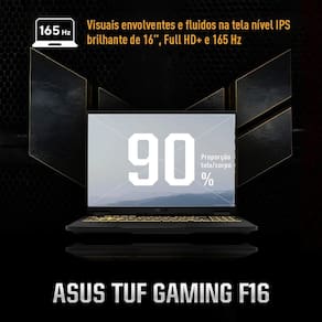 A tela de 16 polegadas do TUF Gaming F16 exibe visuais com alta fidelidade e fluidez, graças ao painel nível IPS de 165 Hz. Com resolução Full HD+ (1920 x 1200), proporção 16:10 e 300 nits de brilho máximo, dá para jogar, assistir a filmes e séries, e trabalhar com muito conforto, mesmo em ambientes muito iluminados.